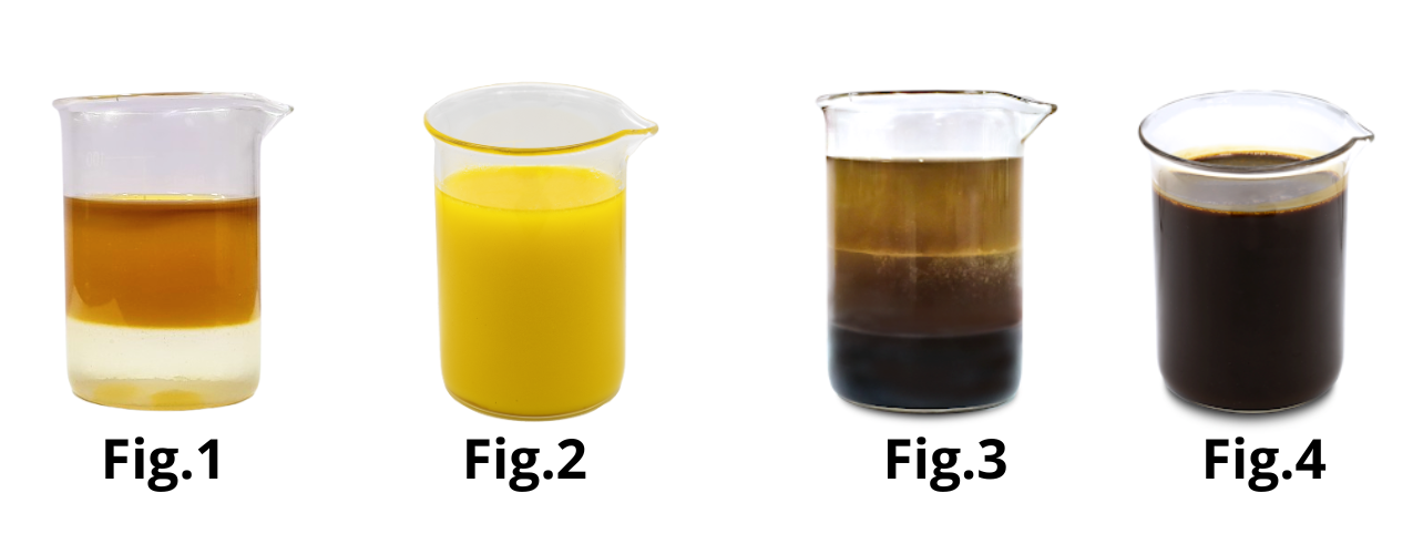 Fig. 1-2, 70% aceite vegetal; 30% H₂O. Fig. 3-4, 40% melaza, 40% aceite vegetal, 20% H₂O. La muestra de la izquierda se obtuvo utilizando nuestro homogeneizador EML mientras que la de la derecha se obtuvo utilizando un mezclador tradicional,.